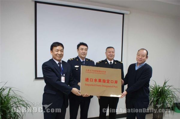 2016年1月17日,新疆出入境檢驗(yàn)檢疫局副局長賽鐵爾汗、烏魯木齊海關(guān)副關(guān)長艾爾肯.吾買爾及高新區(qū)(新市區(qū))副區(qū)長胡啟智帶隊(duì)前往烏魯木齊機(jī)場國際貨站開展進(jìn)境水果指定口岸審核驗(yàn)收。機(jī)場集團(tuán)副總經(jīng)理李正攜烏魯木齊機(jī)場分公司、天緣國際物流公司熱情迎審。