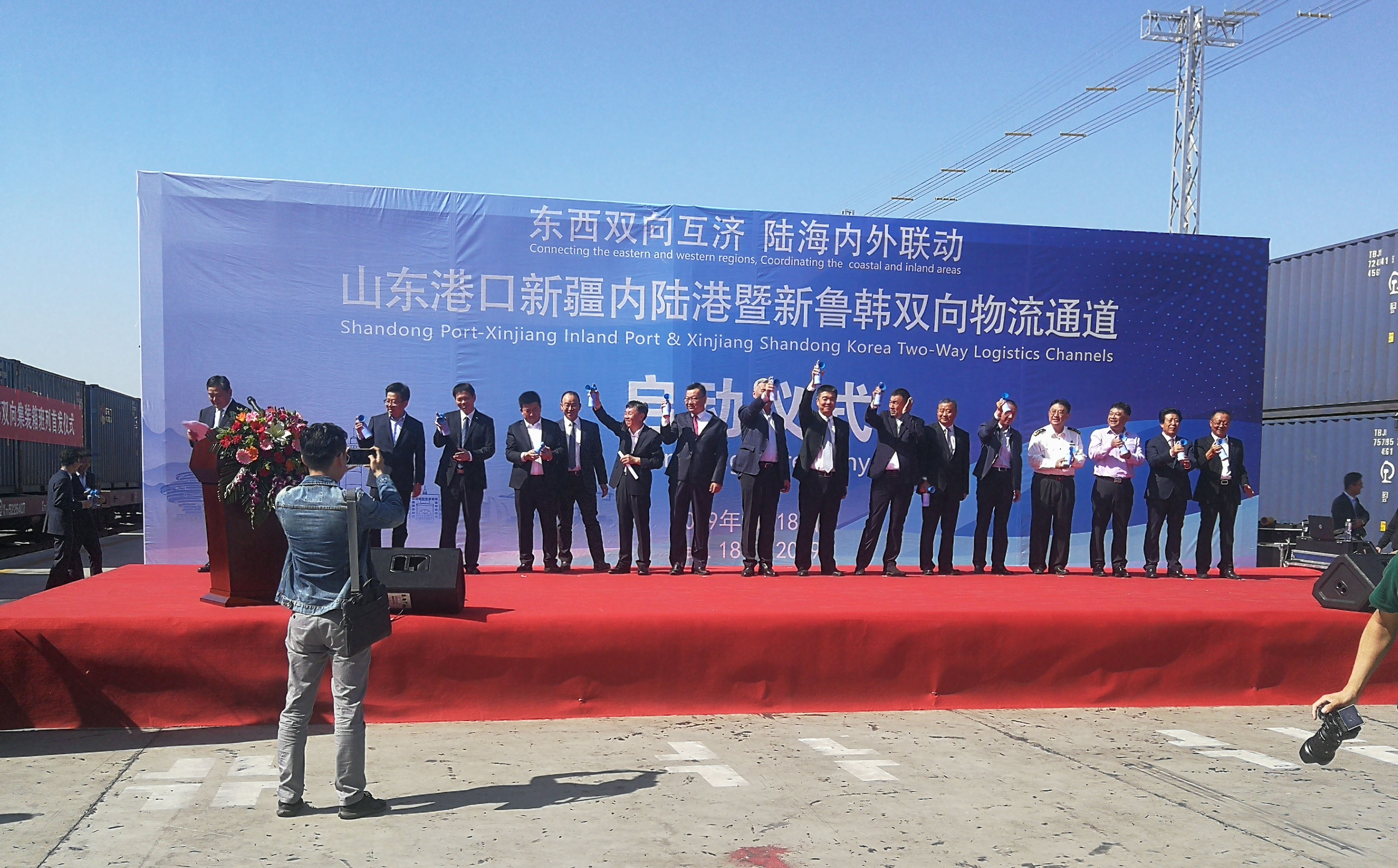 2019年9月18日13時,一列滿載番茄醬的雙向物流通道班列從烏魯木齊國際陸港區出發,途經山東,駛向韓國。該趟班列的開行,為烏魯木齊市周邊及全疆地區進出口企業提供了全新的物流服務。當日上午由山東港口集團主辦,山東港口集團青島港、烏魯木齊國際陸港區承辦的“東西雙向互濟、陸海內外聯動”山東港口走進新疆服務推介會、山東港口新疆內陸港暨新魯韓雙向物流通道啟動儀式在烏魯木齊市舉行。