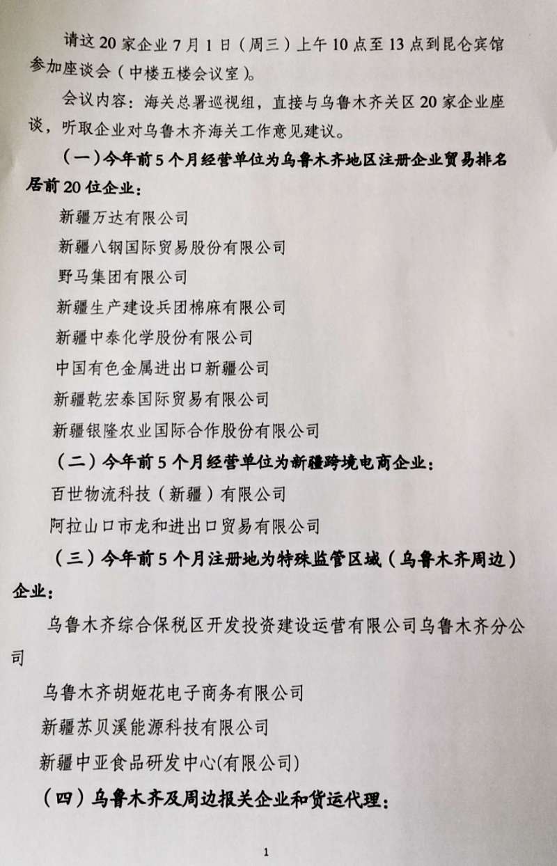 2020年7月1日上午10點-13點,假新疆昆侖賓館中樓五樓會議室,海關總署黨委第九巡視組召開了巡視烏魯木齊海關后的第一次關企座談會。今年前五個月經營單位為烏魯木齊地區注冊且企業貿易排名居前20位之內的企業、今年前五個月經營單位為新疆的跨境電商企業、今年前五個月注冊地為特殊監管區域(烏魯木齊周邊)的企業、烏魯木齊周邊保管企業和貨運代理企業,共二十家單位均派出代表參會。會上,各位代表就今年疫情影響及應對措施、面臨世界經貿形勢持續走低壓力下的新疆企業如何走出困境、為促進企業發展、關企寫作與互動等方面積極踴躍發言,提出了很多好的建議與意見。總署巡視組成員將上述給位代表提出的中肯意見和建議一一記錄在案,表示將協調烏魯木齊海關進行充分溝通積極解決。